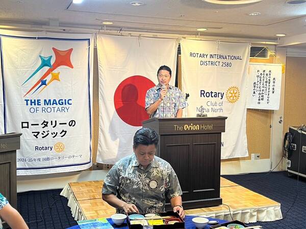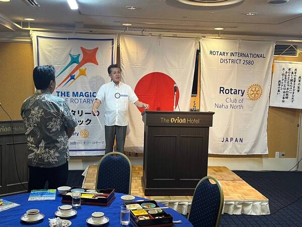 第576回例会 2024.09.09 2024年9月3日(火)12時30分オリオンホテル那覇第573回例会●会長点鐘●ロータリーソンク●会長挨拶●幹事報告●卓話 内間会員 < 第577回例会第573回例会 >